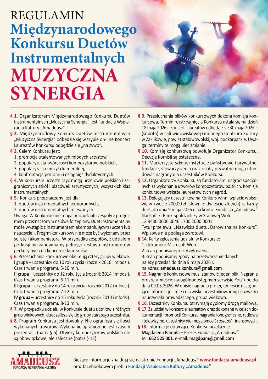 Fundacja Wspierania Kultury „AMADEUSZ” serdecznie zaprasza uczniów szkół artystycznych do udziału w wyjątkowym święcie muzyki kameralnej! Konkurs odbywa się w formule online (przesłuchania nagrań), a zwieńczeniem zmagań będzie Koncert Laureatów „na żywo”. Szczegółowe informacje na stronie: https://fundacja-amadeusz.pl/muzyczna-synergia-2026